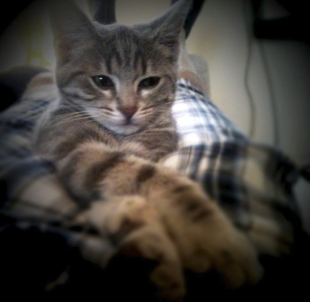 Skipskatt med 5 tær på forpotene. Tigerstripet grå pels med svarte striper, samt litt hvitt. Liten og tynn av vekst.