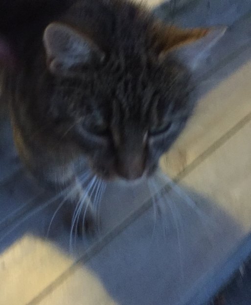 Liten, mjauer, kosete. Går fra fot til fot og stryker seg inntil når man går. Den har ingenting hvitt på seg.