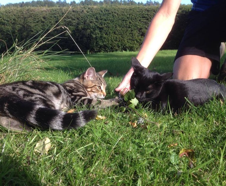 To hannkatter, antakeligvis brødre er funnet på Feen. begge er noe vare, men er allikevel veldig kosete og lekne, flotte katter. De har mast en del utenfor huset en god uke og ble i går (5.09) tatt inn for å få litt mat og vann.