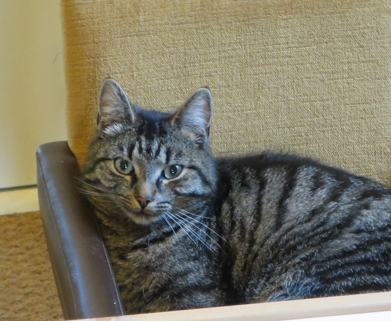 Hun er veldig kosete liker barn og er tigerstripete i grå, svart og brun.