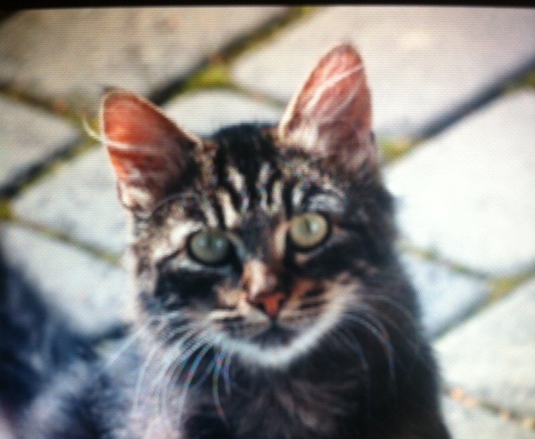 Katten er skremt og redd. Av og til kan den komme litt nær, men det er umulig å klappe den eller "fange" den. Vi kan vise oss i vinduet og snakke til den. Den ser deg rett inn i øynene, men åpnes entredøren forsvinner den til en jasminbusk til den føler seg trygg.
