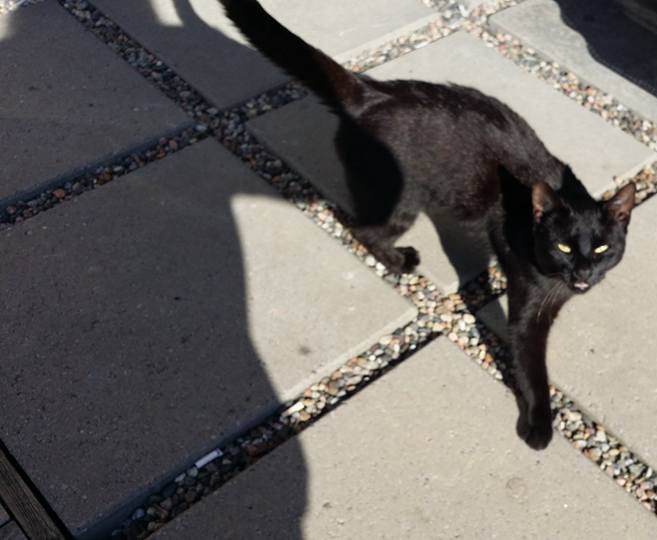 Helt sort. Spinkel pus, alder usikkert, men kanskje rundt ett år. Nylig sterilisert, da sting fortsatt var synlig. Ikke chippet.