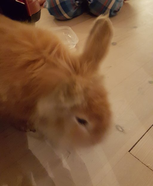 Så kaninen hoppe rundt ute på veien og antok det var noens kjeledyr. Fanget den så fort jeg kunne, så den ikke skulle finne veien til trafikken. Den er veldig tam og tilsynelatende uredd, spiser og hopper nå rundt på stuegulvet.