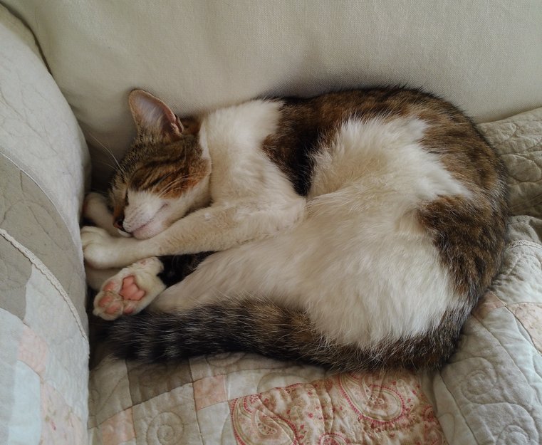 Tigerstripet hale, hvite bein med tigermønster på høyre frem- og bakbein, hvit snute, brun nese.