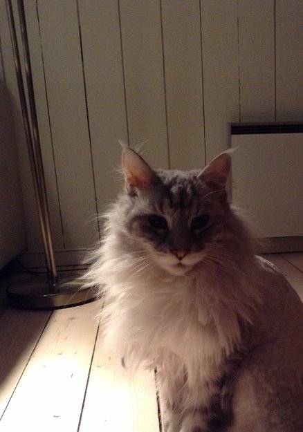 Grå og hvit, med dusker på ørene. Løveklipt for tiden, dvs kort pels på kroppen og lang pels på hale, hode og bein.