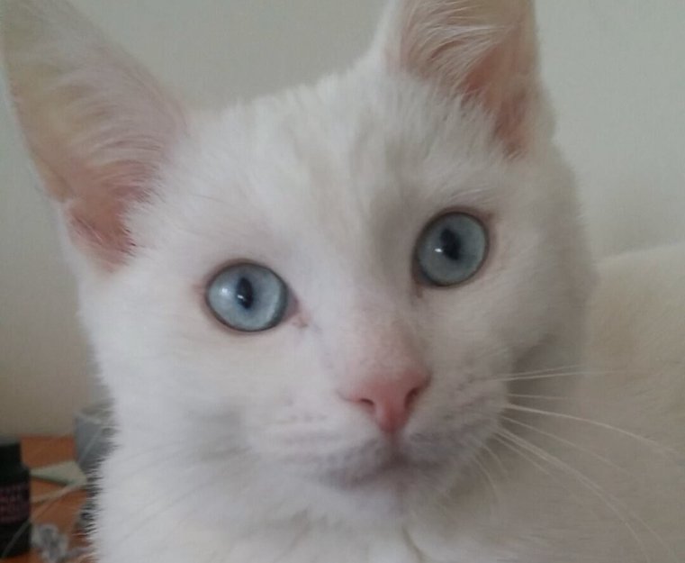 En veldig sosial og veldig kosete katt. Han er utrolig glad i mennesker. Kommer når vi roper pusi til han. Han er helt hvit, store ører og blå øyner.