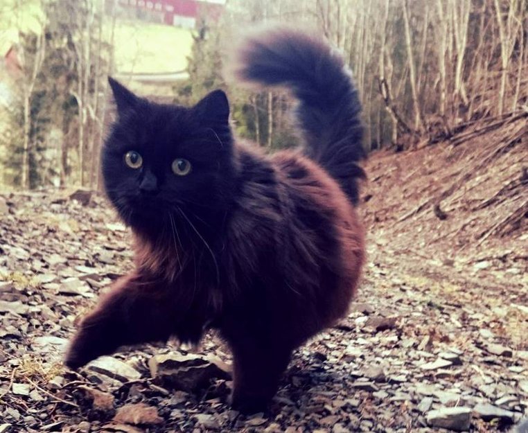 Lille Myh er en brun/sort langhåret hunnkatt. Sterilisert. Kommer som regel når vi roper eller plystrer på henne.
