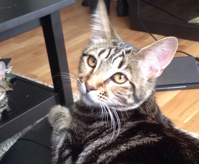 Hun er halvt maincoon og har mye fra den rasen, men er korthåret. Litt lengre pels på magen.