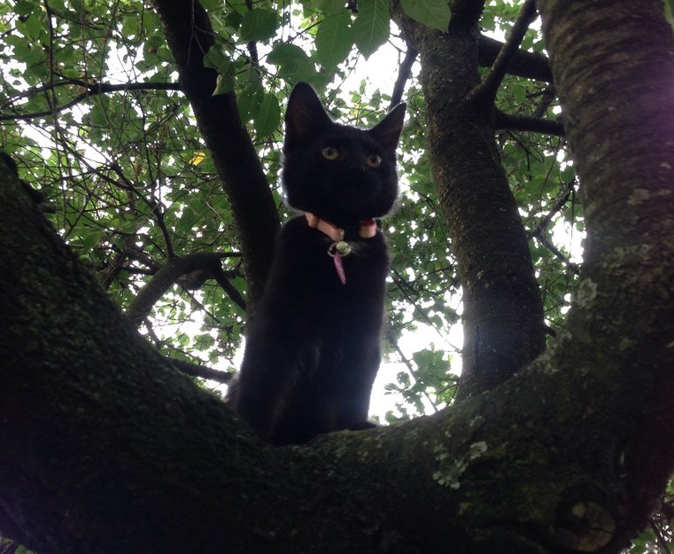 Svart med en liten hvit flekk under halsen og på magen. Rosa halsbånd med eiers tlf. nr. Chippet. 6 måneder gammel.