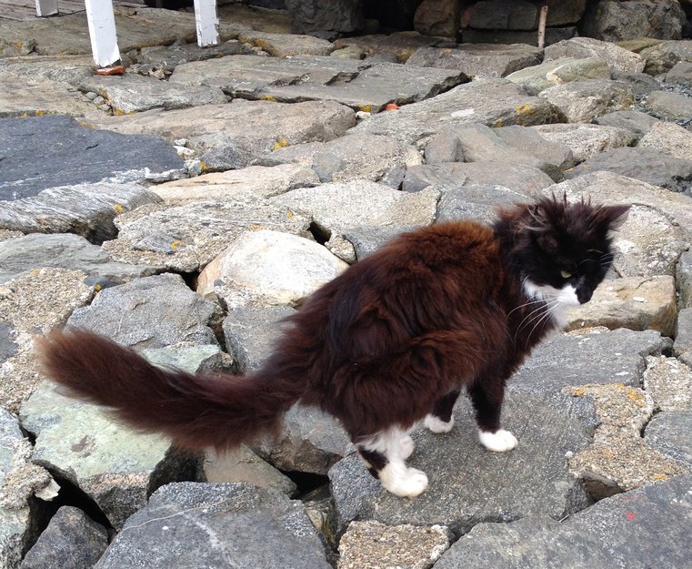 Fann ein katt blandt nokre naust nede i mildevågen, Svart og kvit langhåra. Ganske tynn og full i floker.