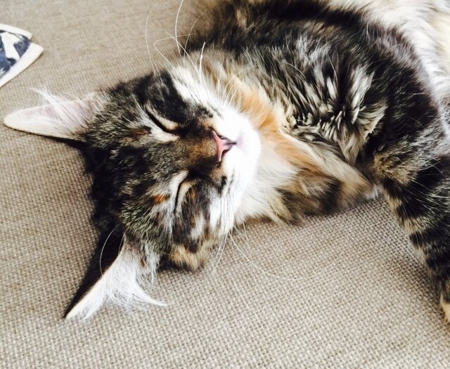 Fjoner i ørene, pene hvite striper ved øynene, buskete hale. Hvitt bryst. Hun er sosial og vil sikkert komme bort til deg for kos eller mat😀 En freidig og uredd kattunge som lett kan gå inn åpne dører...