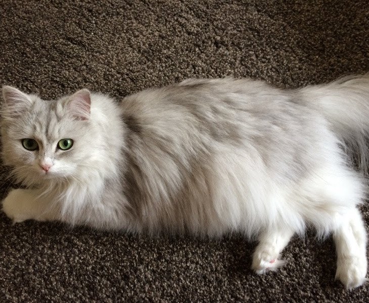 Pus har veldig lange hår på halen og har et halsbånd (grå/lilla) rundt halsen med et telefonnummer på. Det er små nyanser i fargen på pelsen med hvite og grå hår.