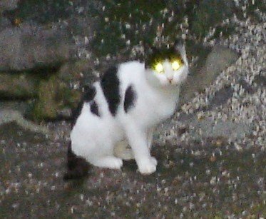 Hvit katt med svarte tegninger, svart på toppen av hodet og svart hale. Se bilde