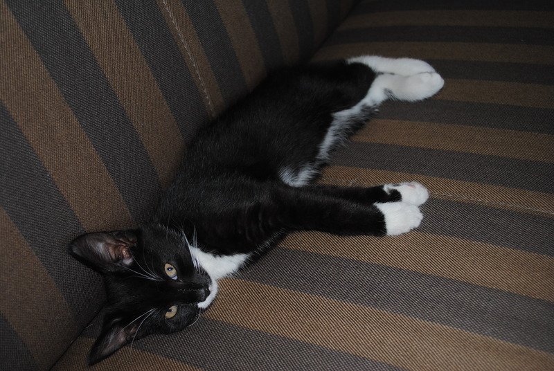 Basse er en ung katt. Han er svart med hvitt bryst, hvite poter og delvis hvit snute.