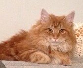 Norsk skogskatt, oransje og hvit. Lang pels, "hårete" ører, hvit i bryst og munn-område, samt hvite poter. Han har en stor buskete hale og har pels som tover seg lett.
