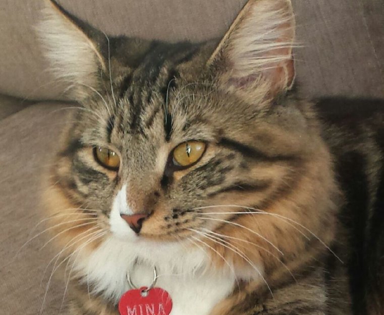 Norsk Skogkatt, sort/brun/hvit tabby. Slank og lett i kroppen, stor sort buskete hale. Rødt halsbånd med hjerte, navn Mina og telefonnummer. Egentlig tillitsfull og nysgjerrig. Kan ha mistet båndet.