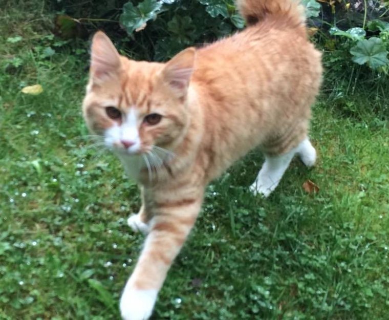 Oransje og hvit, hvit snute, hals ogpoter. Halvvoksen