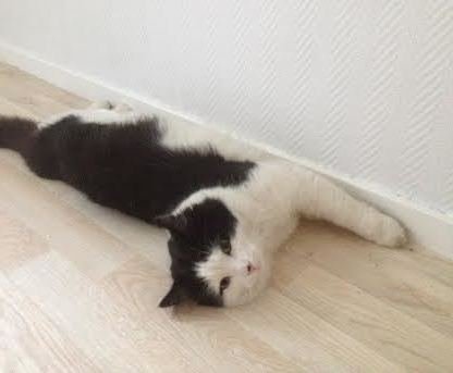 Pusen har gått rundt her i over 1 år, har i det siste begynt å komme inn til meg gjennom katteluka til mine puser. Pusen virker mager, men relativt rolig og tam.