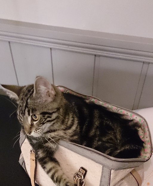 Tigerstripet med spotter på magen. Kjælen og trygg. Vant til barn. Prater og maler mye. God apetitt. 4 måneder, men kan gå for å være litt eldre.