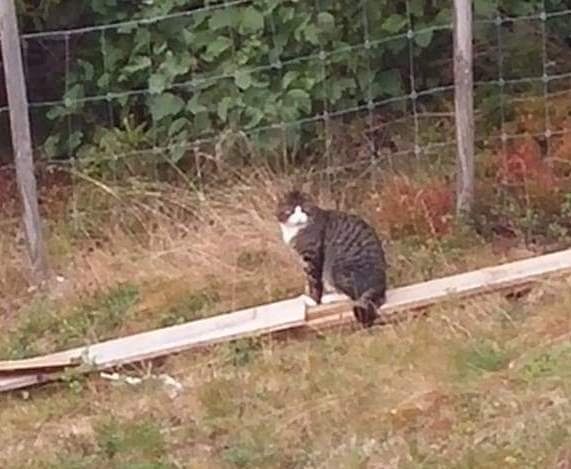 Katten er trolig en ukastrert hannkatt. Den er aggressiv mot andre katter og veldig sky ovenfor mennesker. Vi prøver å gjøre den trygg på oss ved å sette ut tørrfor slik at den slipper spise fra søppelposer. Dette har den gjort siden i sommer ( midten av juli). Ingen i nærområdet vedkjenner seg katten.