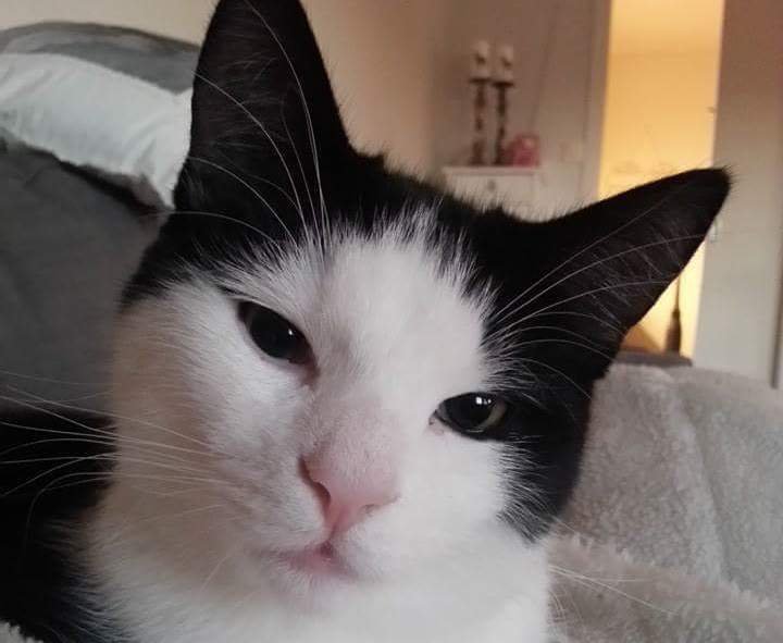 Han har en tydelig hvit trekant I ansiktet. Han er hvit underkroppen og sort på overkroppen. Han har et blått halsbånd med navn og tlfnr på. Og han har chip.