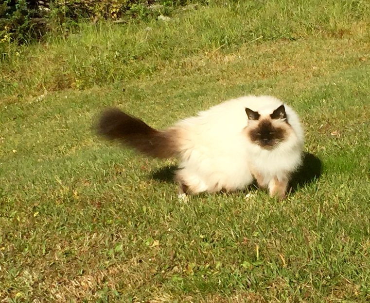 Hun er tynn og liten, kosete og fornøyd. Blå øyne og ekstra hår på nesa. Belinda går ofte i ring og mjauer når hun ønsker oppmerksomhet.
