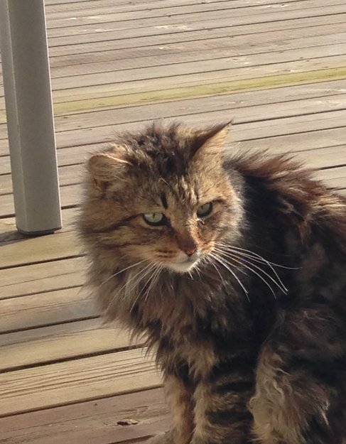 Vi tror det kan være en hunnkatt, men er ikke sikker. Hun bærer preg av å ha vært på rømmen en stund da hun er ganske ustelt. Hun har etterhvert blitt ganske tam, så vi tror hun kan ha hatt en eier en gang.