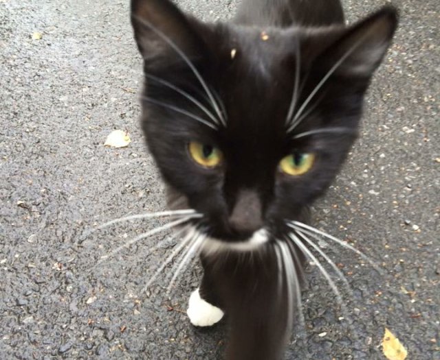 Katten er hovedsaklig sort, men med hvite felt. Virker veldig kontaktsøkende, men også litt skeptisk.