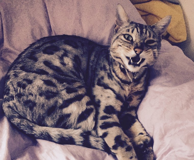 Han er en mellomstor sølvspottet bengal, gulgrønne øyne. Er var for fremmede, men lyer navnet Pisu og om du har en pose dreamies som du rister, da kommer han som regel springendes.