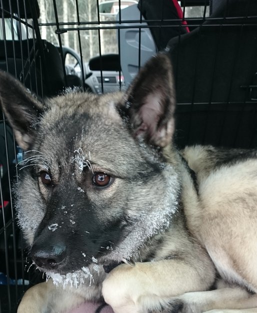 Hun er en relatvt sped og ung norsk Elghund Grå, kun 18 mnd. Hun har veldig markerte øyne, hvor det ser ut som noen har tegnet svart (kajal) eller tusj rundt øynene.
