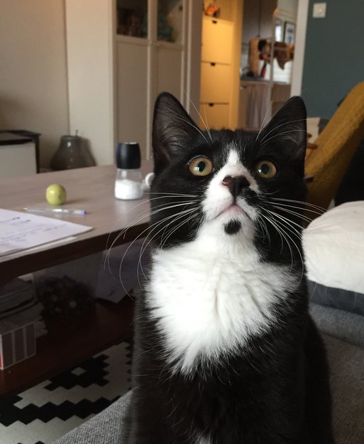 En liten og slank pus, men bøy på halen. Svart bart på ene siden og svart flekk under haka. Veldig nyskjerrig