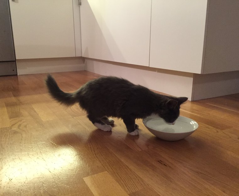 Vi fant en kattunge som er for liten til å være ute alene vandrende i veien.