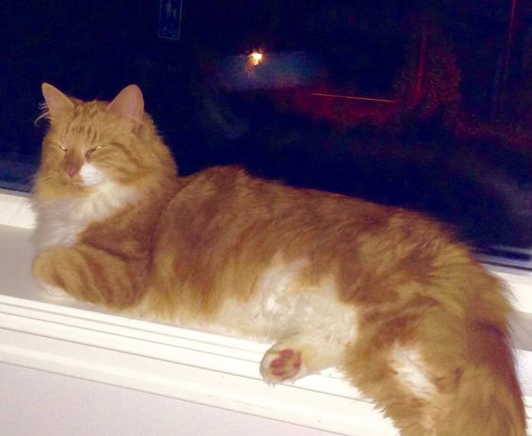 Lang orange og hvit pels. Har en lett gjenkjennelig hvit flekk ved siden av nesen på venstre side.