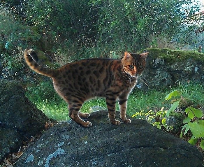 Leopard-mønstret bengalkatt, litt lysere rundt munn. Cirka 4kg. Høres ut som en baby når han mjauer.