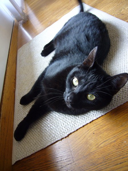 Slank hunnkatt, sort av farge, lyder navnet Rose. Har ikke halsbånd.