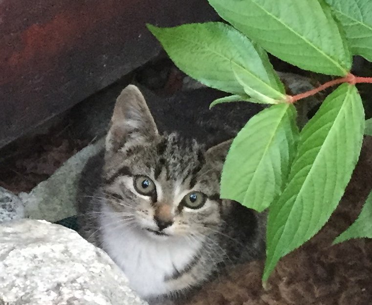 En liten grå stripet kattunge, hvitt bryst hvitt på poter, ikke mange ukene gammel går og mjauer for livet sitt i nabolaget. Så den først i går, tirsdag, den er her nå.