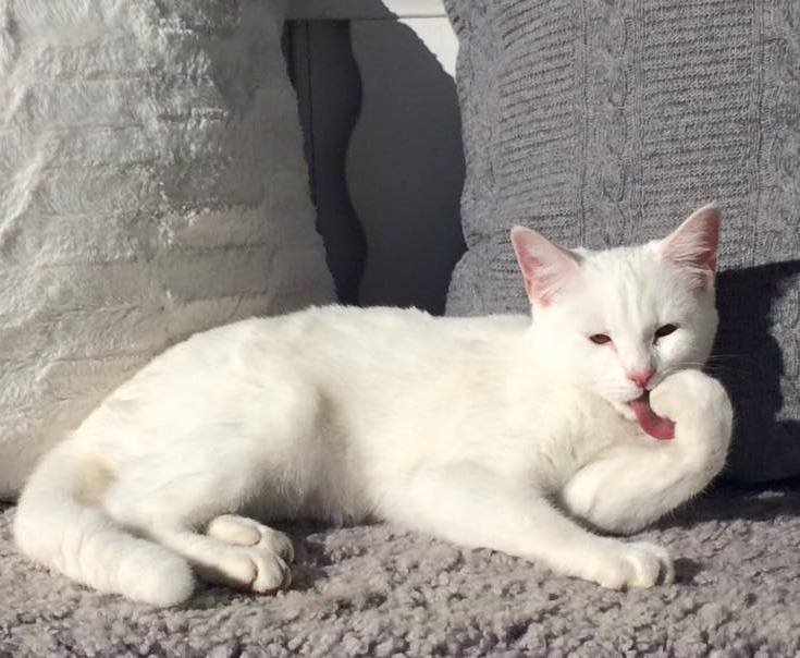 Liten slank hunnkatt ca 7 måneder. Veldig liten brun stripe på hodet. Tillitsfull og kjælen