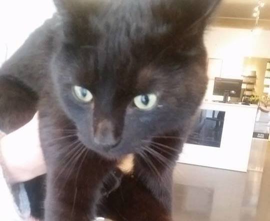 Farge svart med noen få hvite hår under haken. Gul/grønne øyne.