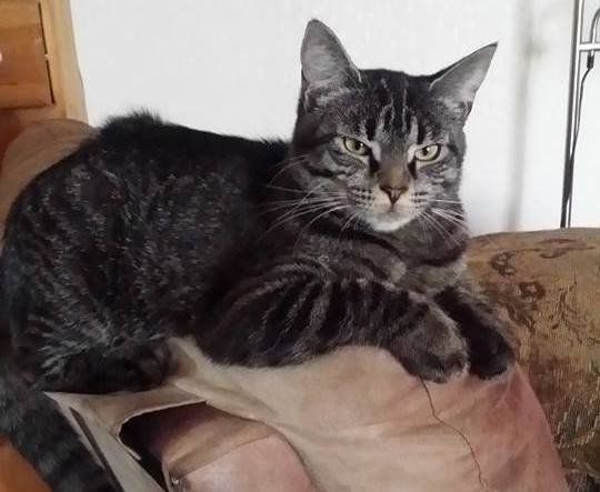 Lyder navnet Lakris. Har bite merker i det ene øret. Liker ikke bli klappet på ryggen/rompa på grunn av sloss kamp. Litt hvit ved munnen å under haka
