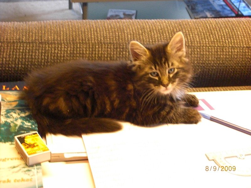 Langhåret med tykk hale, litt spraglet brun/svart. Bildet er tatt da den var kattunge.