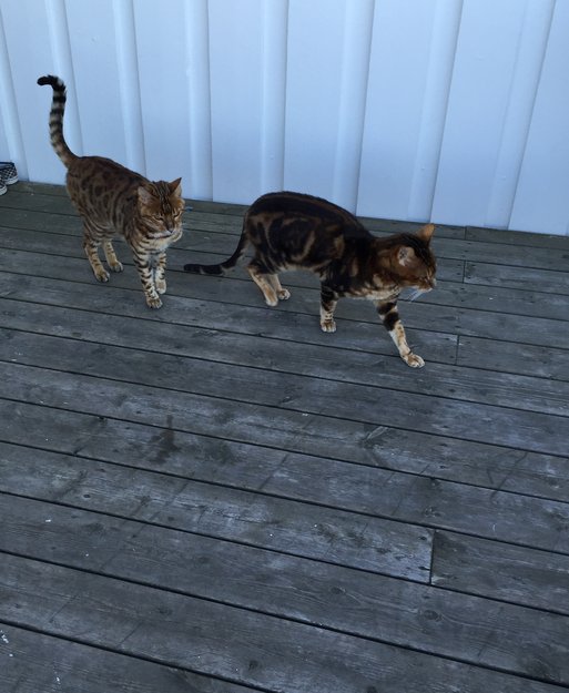 Det er 2 av disse kattene, en av hvert kjønn. De er av rase Bengal, og er på vår veranda nesten hver dag, men er borte om kvelden. De virker sultne og noe bortkomne. Regner med at noen eier disse fine rasekattene.