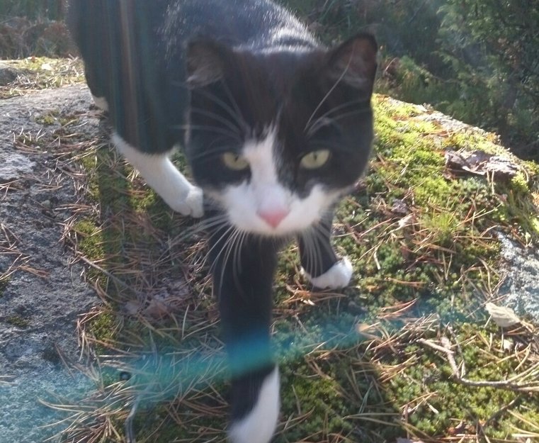 Sort og hvit kastrert hannkatt med rødt, slitt strikkhalsbånd med bjelle og navnesylinder som har mistet korken og innhold observert på toppen av Bjønnåsen i dag kl 15.00. Tillitsfull og kontaktsøkende, tilsynelatende frisk og i godt hold. Han har kanskje fulgt etter noen turgåere opp, eller har hjem ikke så langt unna? Men et veldig underlig sted for en katt å oppholde seg, nærmeste bebyggelse er ca 1,5 km unna.
