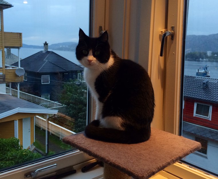 Sort korthåret hannkatt med delvis hvitt ansikt, bryst og mage. Samt hvite ben og poter. 2 år gammel og ca 3kg.