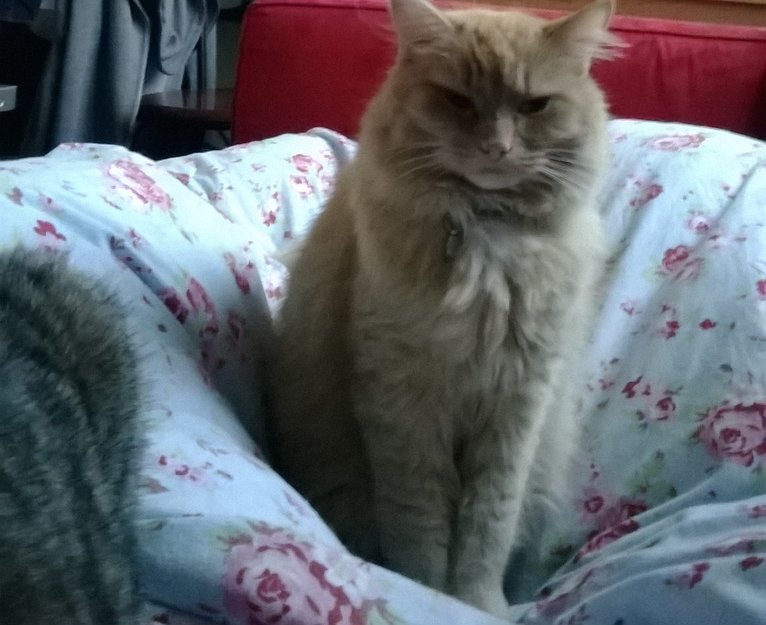 langhåret oransje/creme farget hannkatt, ganske liten av vekst, id merket i øret