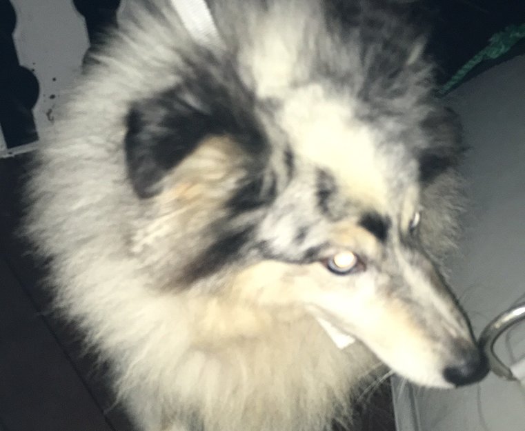 Lyseblå øyne, langt snuteparti, usikker på rase men ligner engelsk sheepdog. Gråsvarte ører, veldig rolig og snill. Fluffy men floket pels.