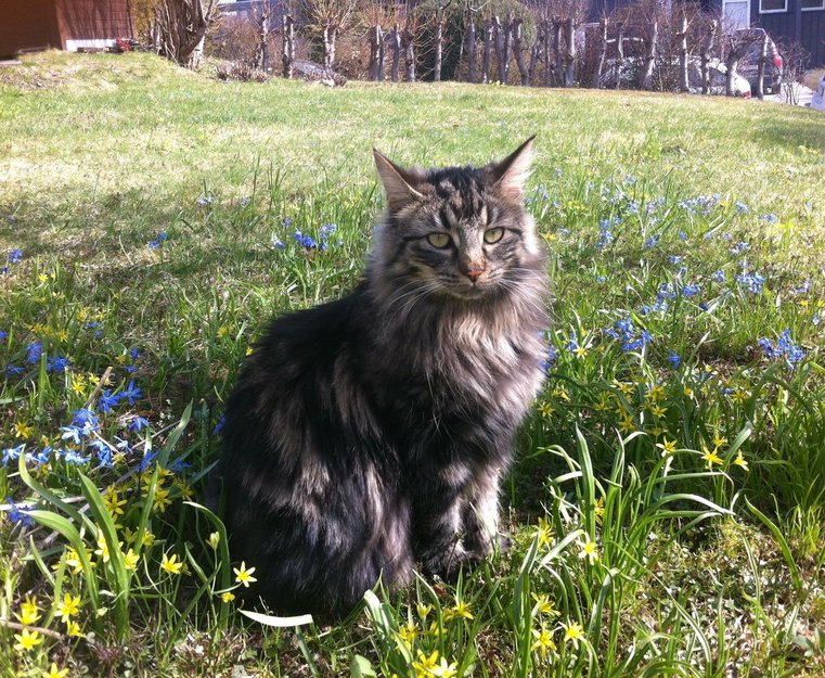 Tigerstripet, brun og svart. Langhåret og forholdsvis stor. Forsiktig pus med lys stemme.