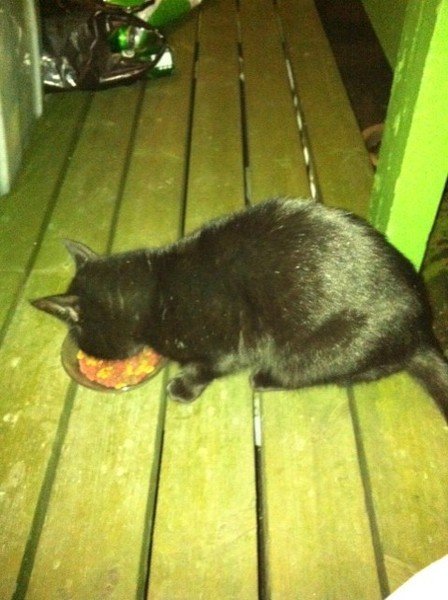 Oppdaget pus i en søplesekk på jakt etter mat i begynnelsen av måneden. Er konstant sulten og savner tydelig menneskene sine. Har to katter selv som setter lite pris på selskap