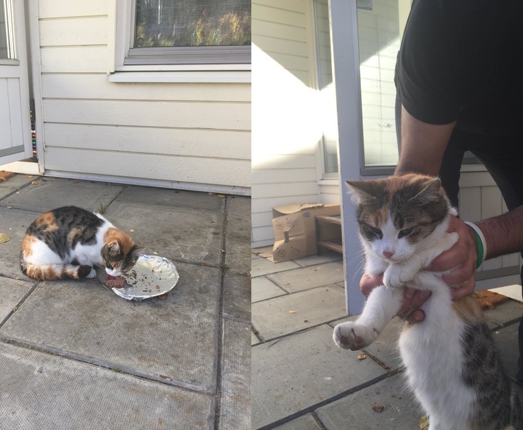 Denne katten blir matet av naboen og vi har hørt oss rundt om noen kjenner eller eier katten, men det er det ingen som gjør. Den har ikke chip (vært hos veterinær), men veldig kosete, ung katt.