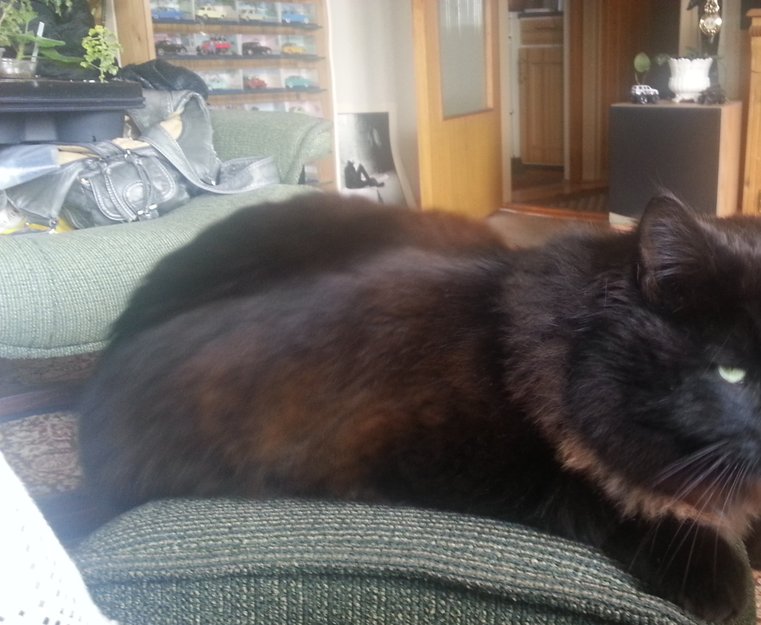 Sort pels,langhåret. Har en hvit flekk mellom bakbeina. Har et barbert felt på ene siden.