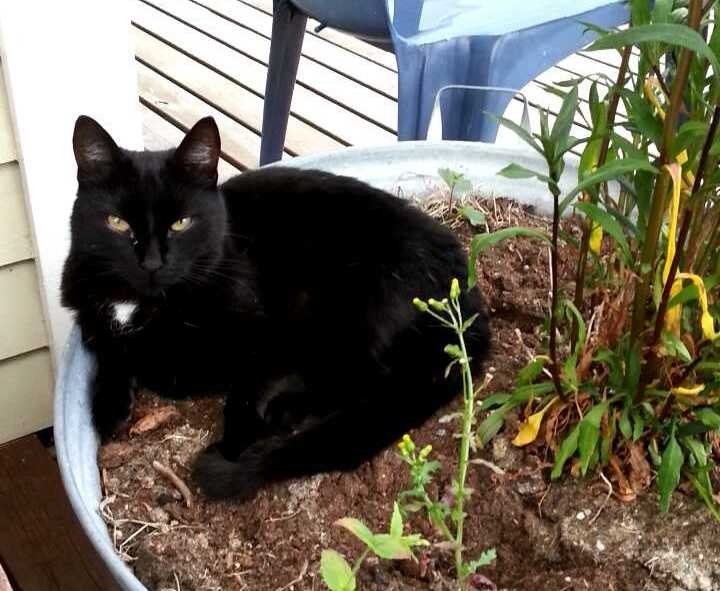 Liten og tynn katt. Svart med hvit flekk på brystet. Har ett hvitt værhår, og lysegule store øyne.